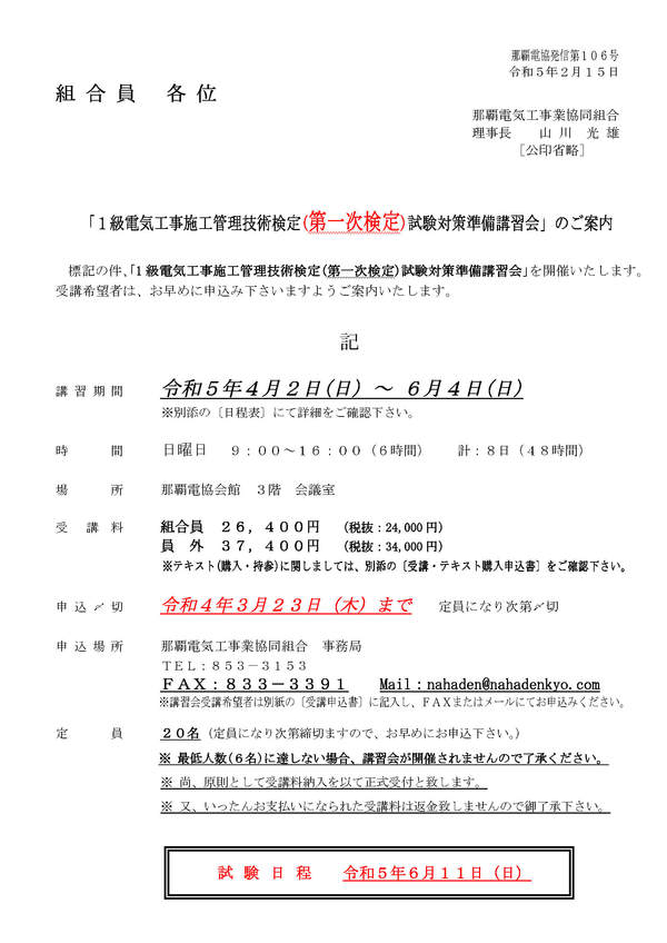 ■開催セミナー【1級電気工事施工管理技術検定(第一次検定)試験対策準備講習会】 2023.02.16 セミナー情報 1級電気工事施工管理技術検定(第一次検定)試験対策準備講習会 日程表1級電気工事施工管理技術検定(第一次検定)試験対策準備講習会 申込書 < ■開催セミナー【第二種電気工事士(上期:筆記)試験対策準備講習会】■開催セミナー【有接点シーケンス制御(基礎編)】 >
