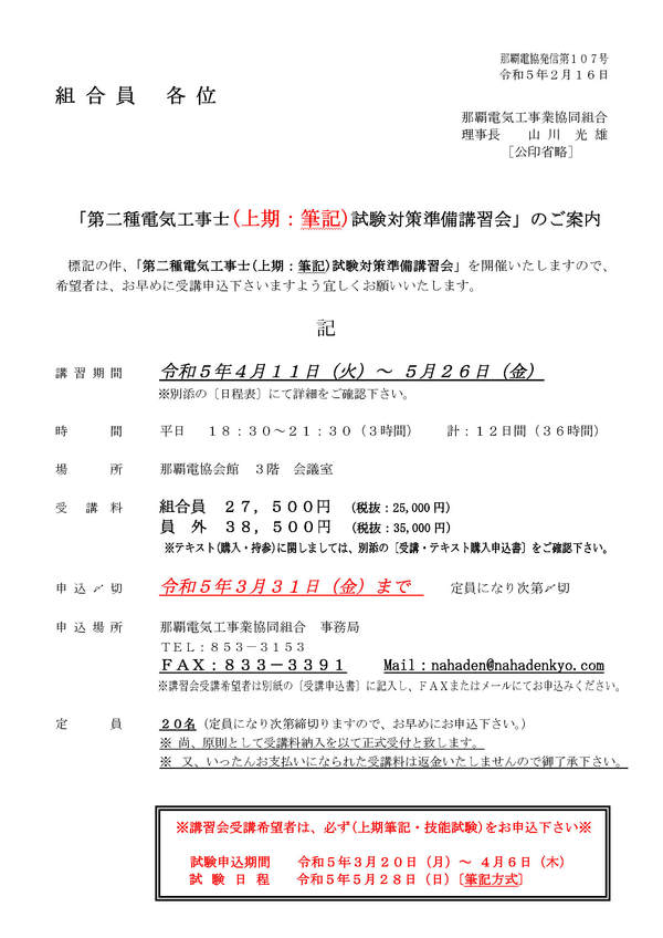 ■開催セミナー【第二種電気工事士(上期:筆記)試験対策準備講習会】 2023.02.16 セミナー情報 第二種電気工事士(上期:筆記)試験対策準備講習会 日程表第二種電気工事士(上期:筆記)試験対策準備講習会 申込書 < ■開催セミナー【積算・見積りのためのパソコン活用技術(関数編)】■開催セミナー【1級電気工事施工管理技術検定(第一次検定)試験対策準備講習会】 >