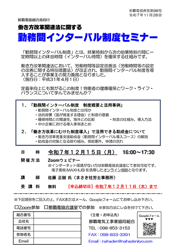 開催セミナー【那覇電協組合員向け 働き方改革関連法に関する「勤務インターバル制度セミナー」】 2025.12.01 セミナー情報 日程表Googleフォームお申込み → https://forms.gle/rdQv3mWt8jTR9XCy8 開催セミナー【有接点シーケンス制御の実践技術セミナー】 >