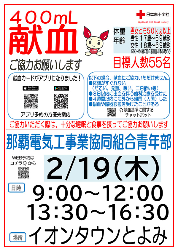 那覇電協青年部主催「第3回 団体献血」のご案内 2026.01.30 イベント 那覇電協青年部主催 《第3回 団体献血》■開催日:令和8年2月19日(木)■時間:9:00~12:00/13:30~16:30■場所:イオンタウンとよみ一般の方も大歓迎ですので、ぜひご来場ください!!※混雑暖和のため、組合員様には事前申込みのご協力をお願いしております ご理解のほど宜しくお願い申し上げます 働き方改革関連法案に関する「勤務間インターバル制度セミナー」開催のご報告 >