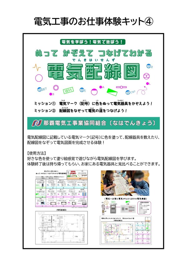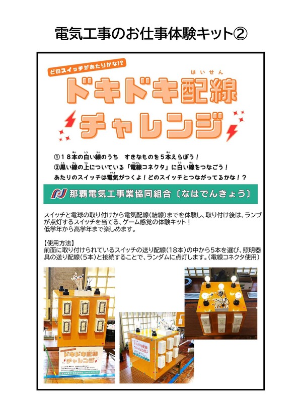 那覇電協では、一人でも多くの子ども達に電気工事士のお仕事に興味を持ってもらえるよう、オリジナルの「電気工事士のお仕事体験キット」を製作しました。