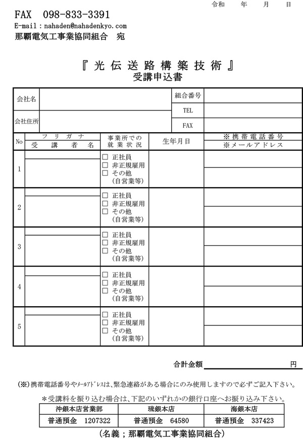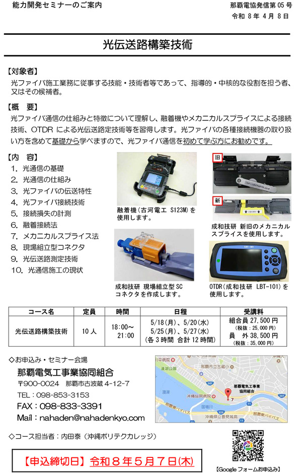 開催セミナー【光伝送路構築技術セミナー】 2026.04.10 セミナー情報 能力開発セミナーのご案内 光伝送路構築技術受講申込書■Googleフォームお申込み < 開催セミナー【積算・見積りのためのパソコン活用技術(関数編)セミナー】開催セミナー【第二種電気工事士(上期:学科)試験対策講習会】 >